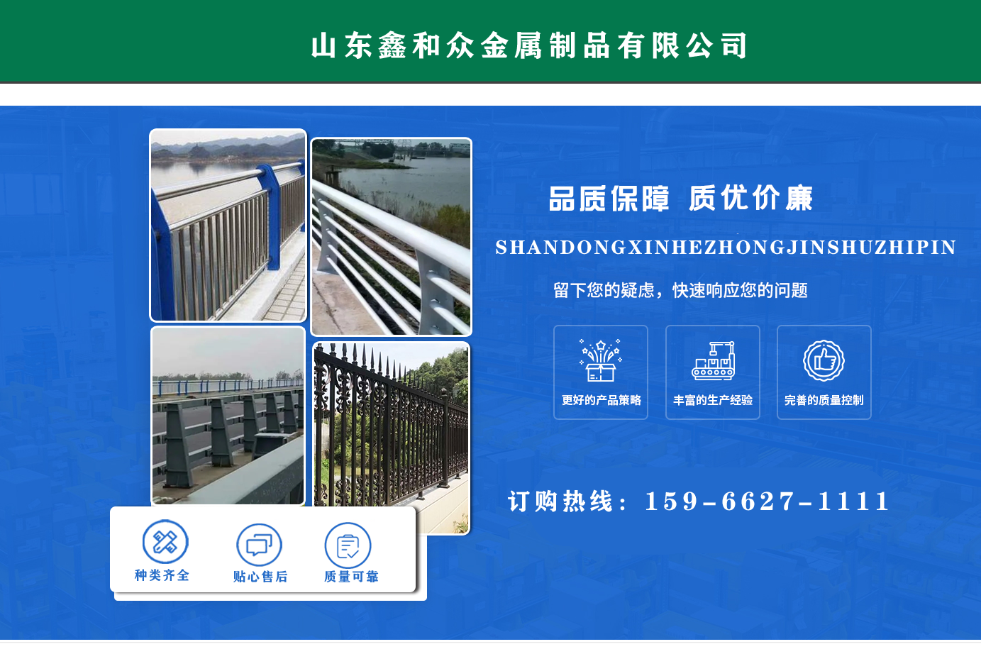 山東鑫和眾金屬制品有限公司主要產(chǎn)品有防撞護(hù)欄,橋梁護(hù)欄,道路護(hù)欄,河道護(hù)欄,不銹鋼護(hù)欄等護(hù)欄。提供設(shè)計(jì)方案,一站式定制,包您滿意價(jià)格優(yōu)惠,歡迎來電咨詢!    公司常年從事銷售護(hù)欄防撞護(hù)欄,橋梁護(hù)欄,道路護(hù)欄,河道護(hù)欄,不銹鋼護(hù)欄,橋梁鋼護(hù)欄,河道燈光護(hù)欄等。產(chǎn)品廣泛應(yīng)用于橋梁、河道、旅游景區(qū)、道路、公路、公園、小區(qū)、景觀、道路防撞等領(lǐng)域。    公司產(chǎn)品均采用優(yōu)質(zhì)不銹鋼材料,符合相關(guān)標(biāo)準(zhǔn)。各種型號(hào)不銹鋼復(fù)合管及護(hù)欄,質(zhì)量嚴(yán)格把控。產(chǎn)品強(qiáng)度高、耐腐蝕、焊接牢固、抗沖擊、性能好,防撞護(hù)欄結(jié)構(gòu)簡(jiǎn)單、美觀實(shí)用大方。     歡迎前來訂購(gòu)!...